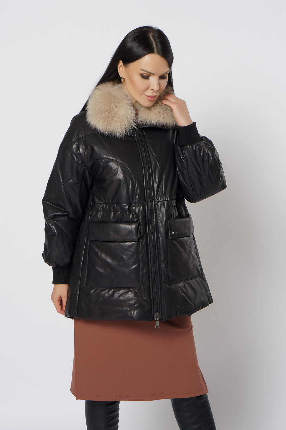 Утепленная кожаная куртка с песцом