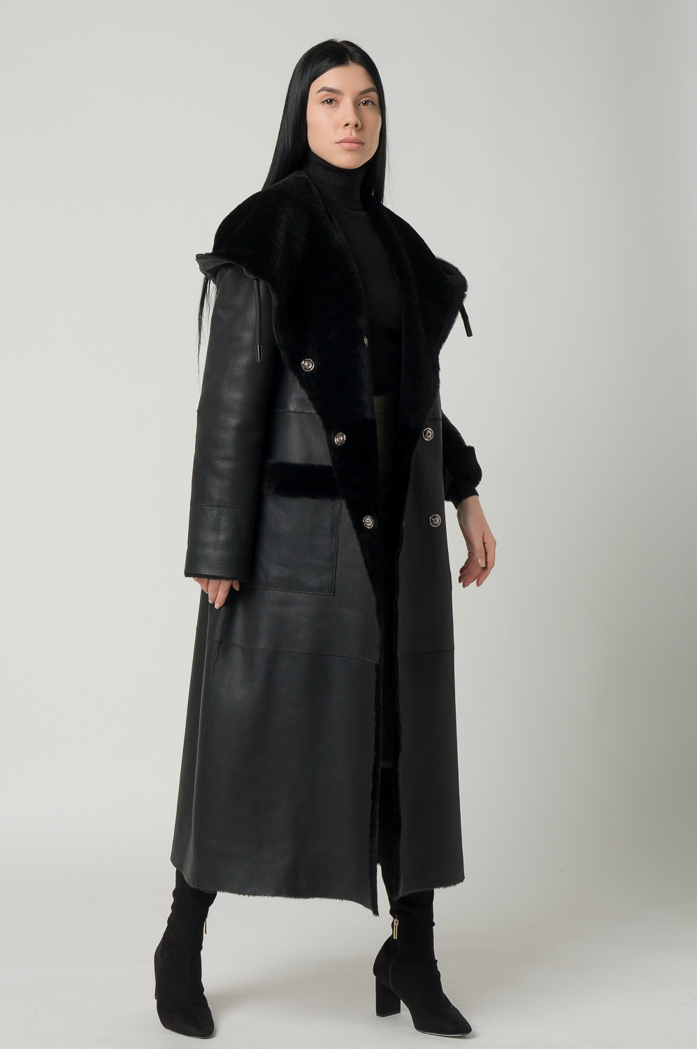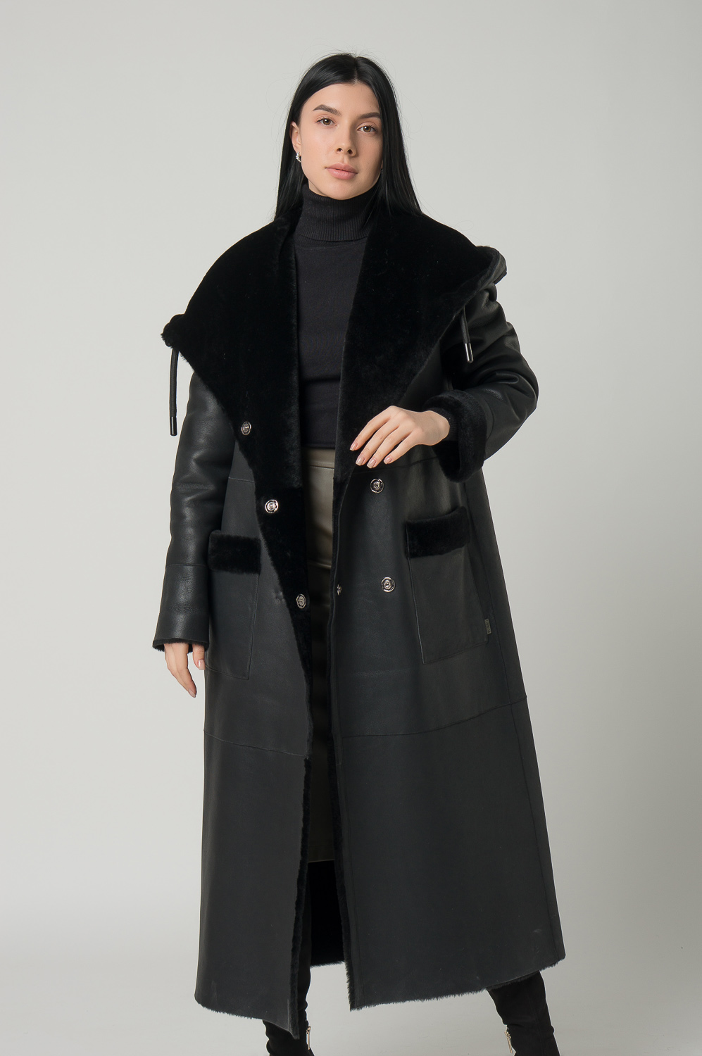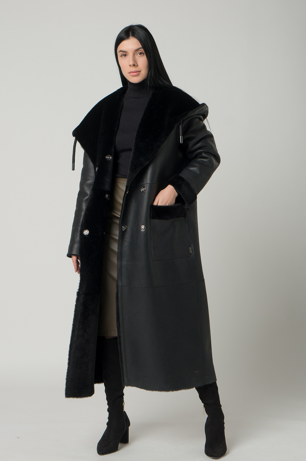 Удлиненная женская дубленка с акцентным капюшоном. Мех мериноса мягкий и хорошо согревает, а помогает ему в этом дубленая кожа, которая не пропускает холодный воздух. Высокое качество изделия позволяет вам носить модель не один сезон. Дубленка дополнена накладными карманами, кнопками и поясом. Представлен широкий размерный ряд до 54 размера.